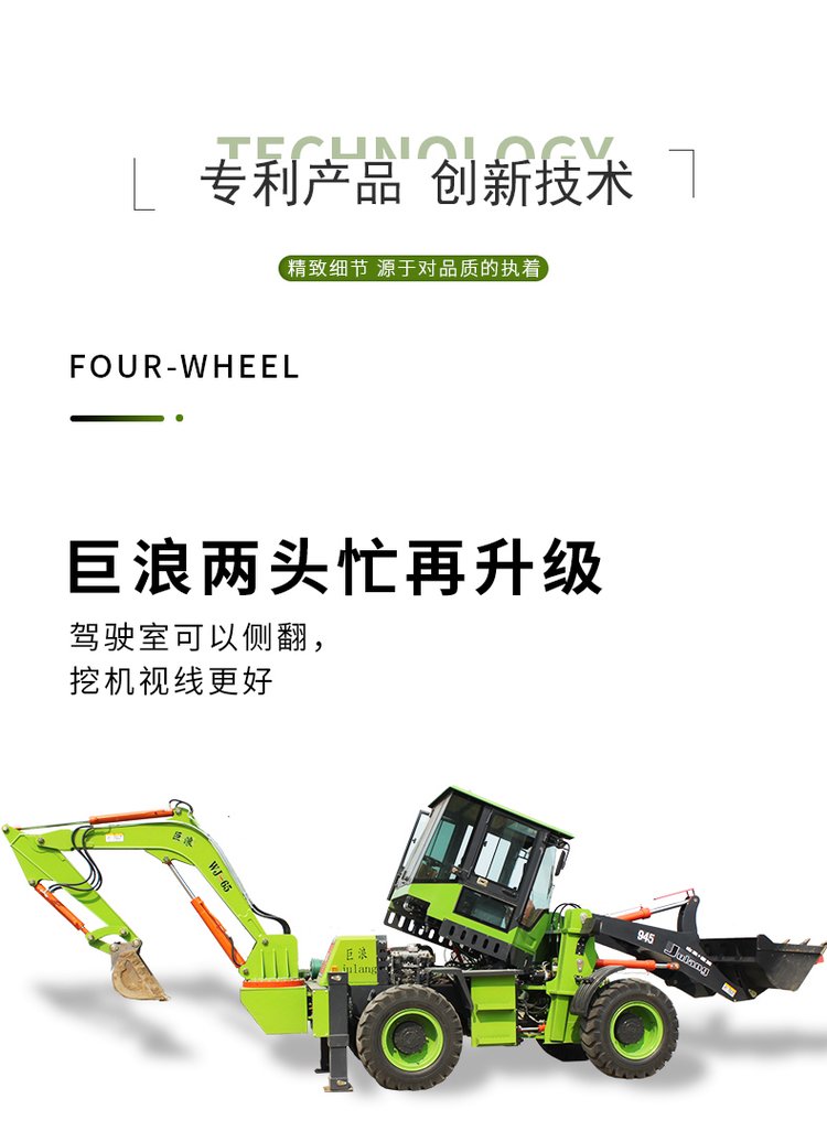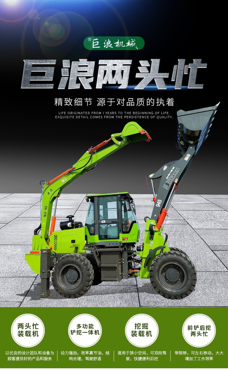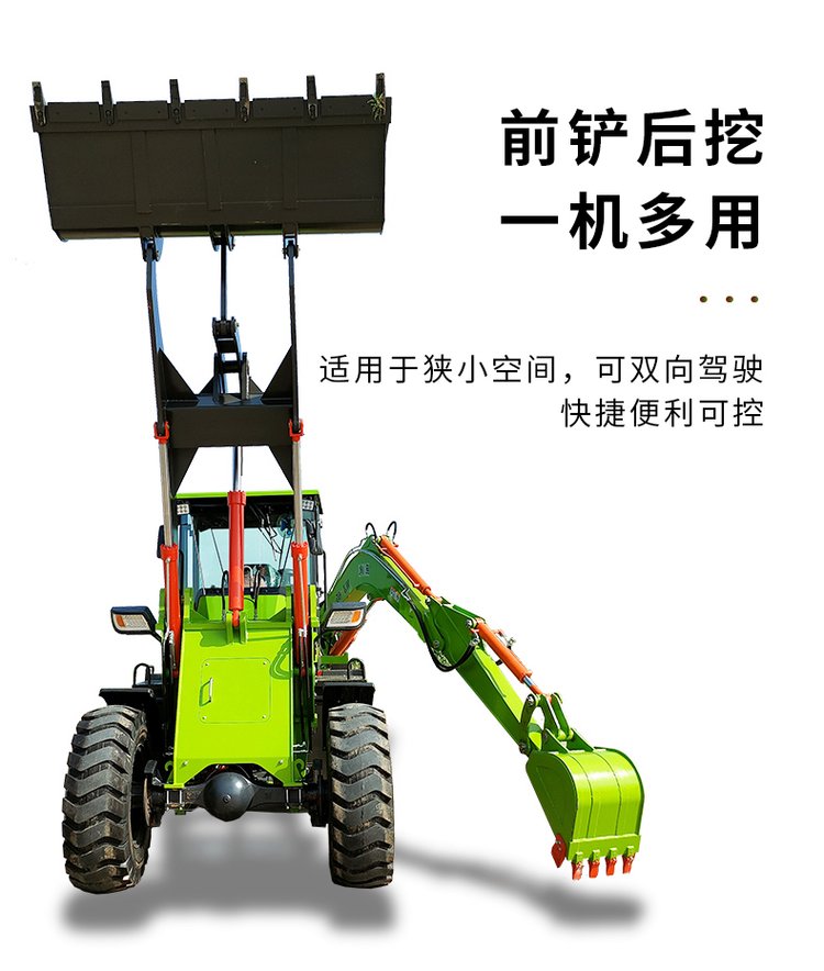 連接復合動作一拖二操作手柄,簡介易操作由于它具有共同的結構,前端是裝載設備,后端為發(fā)掘設備。在施工時,操作手只需求翻滾一下座椅,就可以結束從裝載機到發(fā)掘機的改動。鏟挖一體機首要用于城市和村莊的公路制作及維護、電纜鋪設、電力和機場工程、市政制作、農(nóng)田水利制作、村莊住宅制作、開山取石以及各種小型建筑隊所從事的各種建筑施工工程。“兩頭忙”歸于小型多功能工程機械的一種,一般在大工程結束后的小工程中運用。它可配多種作業(yè)設備及輔具,進行發(fā)掘、鏟裝、路面破碎、平整場所、開挖水溝、鋪設管道等多種作業(yè)。